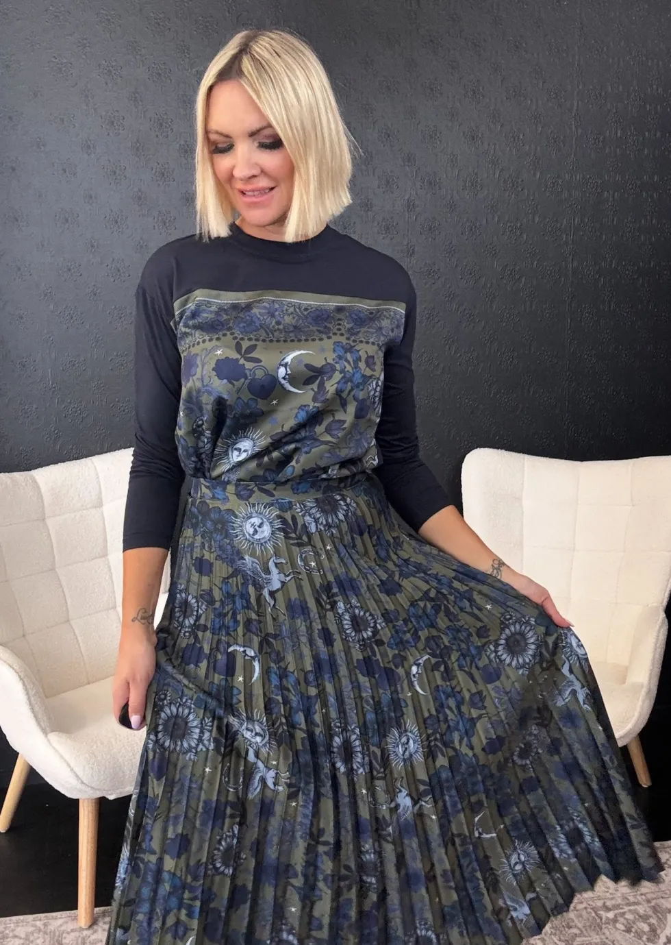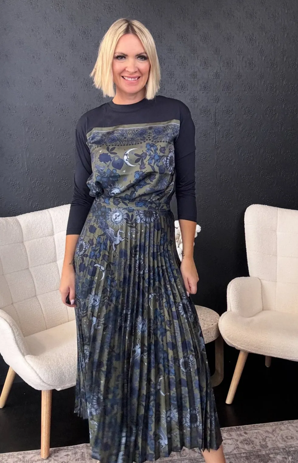 Greenwich Skirt -Olive Multi LS2915 by Loobie's Story at The Wardrobe. 100% Polyester Pleated skirt made in a lustrous soft twill, with a side entry invisible zip and back elastic waistband for a flattering fit.