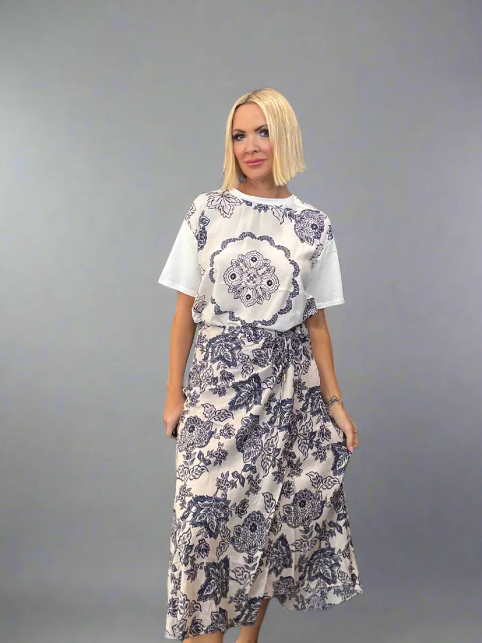 Indie Skirt – Bone Multi LS3014 by Loobies Story at The Wardrobe Wrap style skirt in a silk blend, featuring a unique ruching tie, with the underlayer fixed at the side seam for comfort. Featuring a side zip and elasticated back waist. 35% Silk 65% Rayon Gentle cold machine wash using mild detergent. Do not rub/soak/w