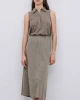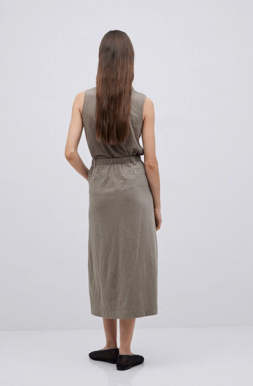 Khaki Slub Cotton Midi Skirt 42217 by Yerse at The Wardrobe. Midi skirt. Slub-cotton fabric. Mid rise. Elastic waist. Belt loops. 2 side pockets. 2 decorative buttoned pockets at the back. Model is 175 cm tall wearing size S. Composition: Fabric 1: 100% cotton Fabric 2: 60% linen, 40% cotton. MATERIALS: Cotton garments