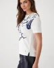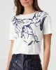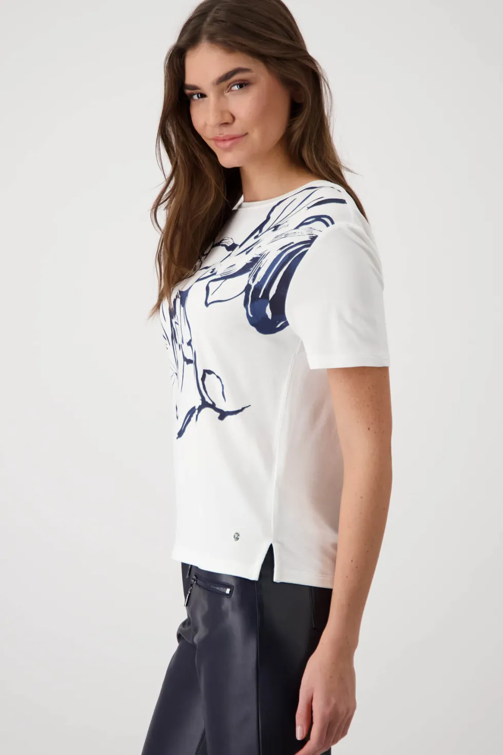 Navy Floral Print T-Shirt 409092 by Monari at The Wardrobe. Flowing viscose with modal Stretchy material Floral print Rhinestones Soft feel Regular fit Round neckline Short sleeves Logo plate The model is 1.77 m tall and wears size 36. The length of size 38 is 60 cm. The floral print T-shirt is made from a flowing visc