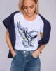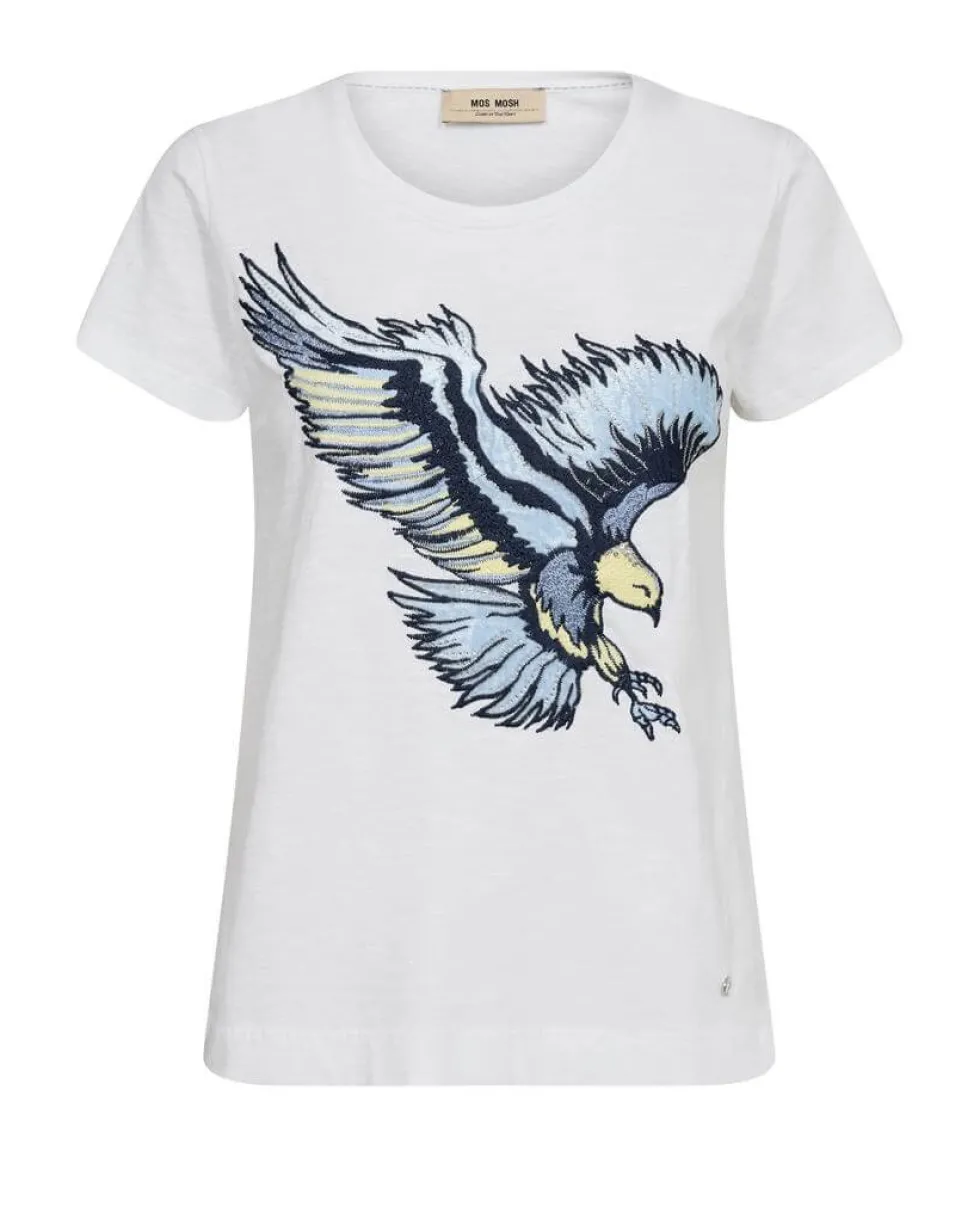 Rem Eagle Tee – White – MS169900 by Mos Mosh at The Wardrobe Make a statement with this fitted tee, showcasing an embroidered eagle print on the front with hand-finished stone and sequin details. Perfect with tailored pieces or vintage wash jeans for a relaxed vibe. Wash with similar colours Do not iron on embroidery U