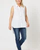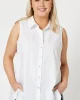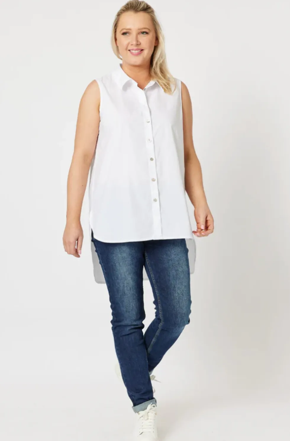 44870 – Jordan Sleeveless Shirt – White by Threadz At The Wardrobe Features: Sleeveless Relaxed fit Hi lo hem Button up Longline Fit Guide: 100% Cotton Soft collar Mother of pearl buttons Side splits
