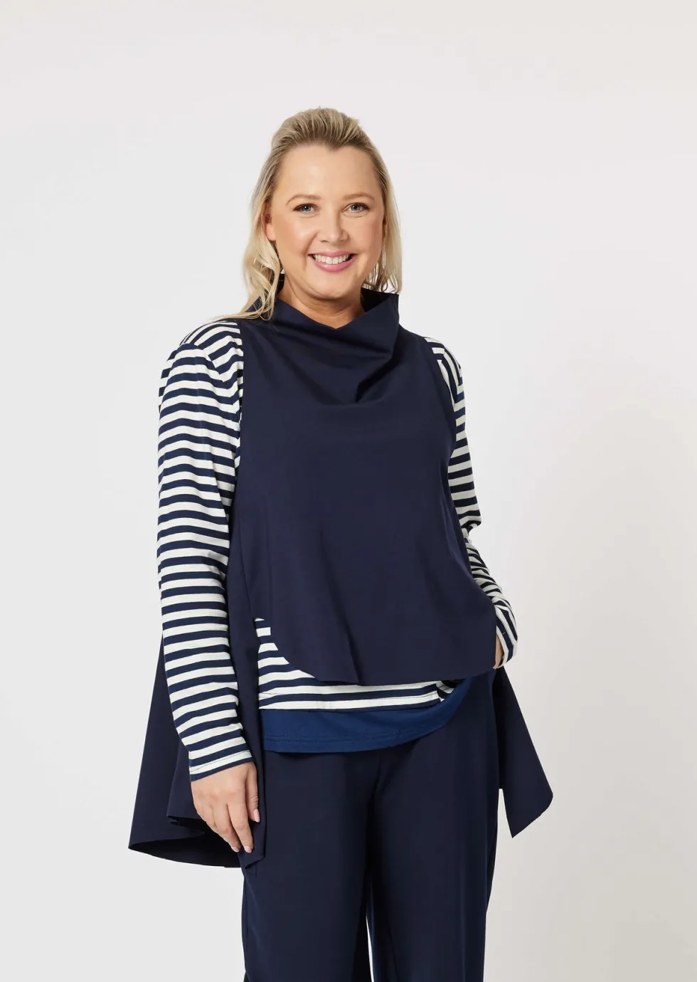 Viscose 62% Nylon 32% Elastane 6% Features: Sleeveless with drop armholes Oversized fit for ease with layering Hi-Lo hem design Fit Guide: Viscose/Nylon/Elastane Super stretch fabric High mock neck Swing back, for ease of movement & layering Generous Label – We Recommend Going Down a Size.