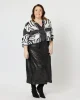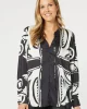 44805 – Chic Print Top – Black by Hammock and Vine at The WardrobeFeatures: 100%Polyester Soft fluid satin finish All over print Pop over the head style Flat nehru collar V neckline with self ties Cuff & button opening on sleeve Fit Guide: Relaxed fit Collared Long sleeve