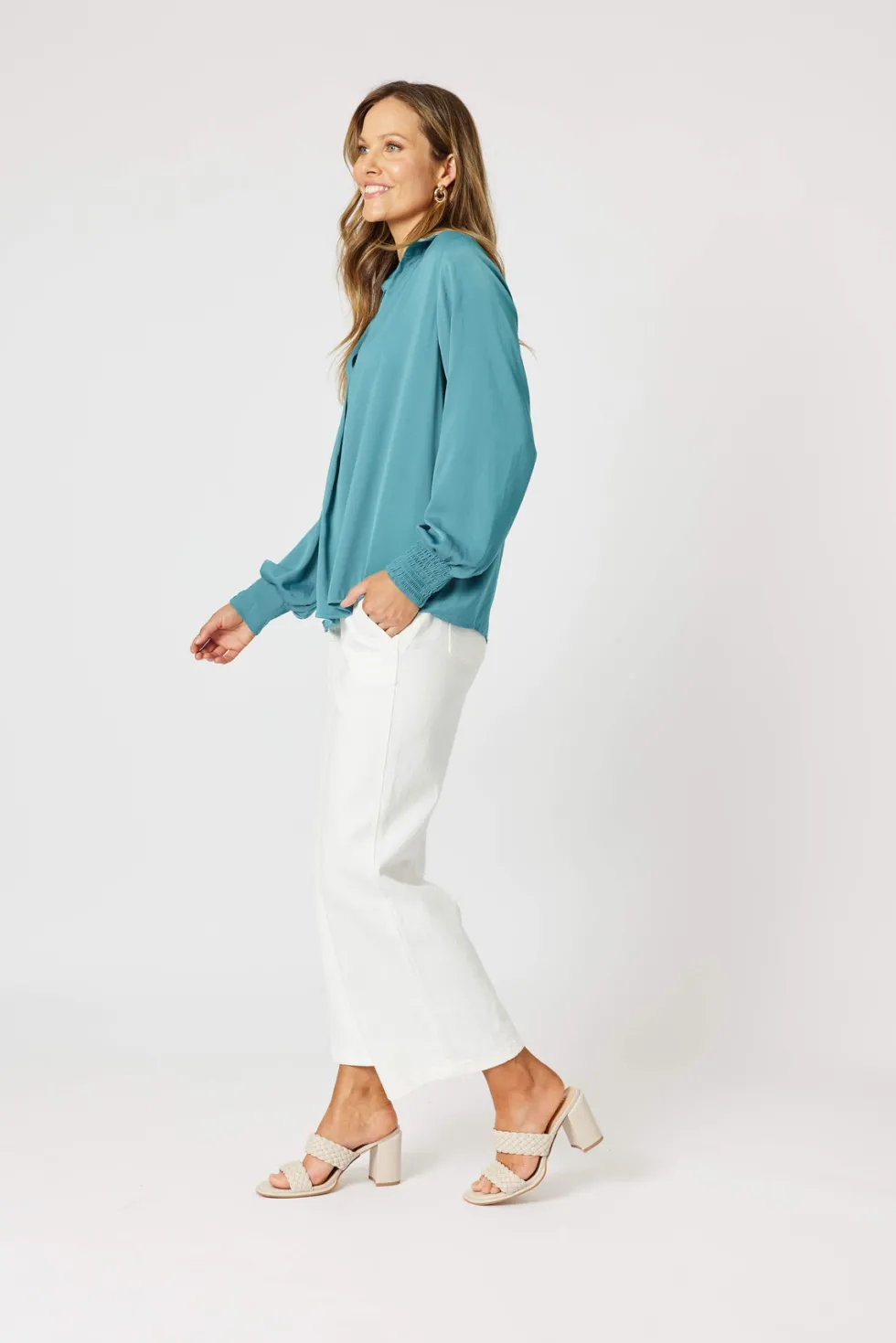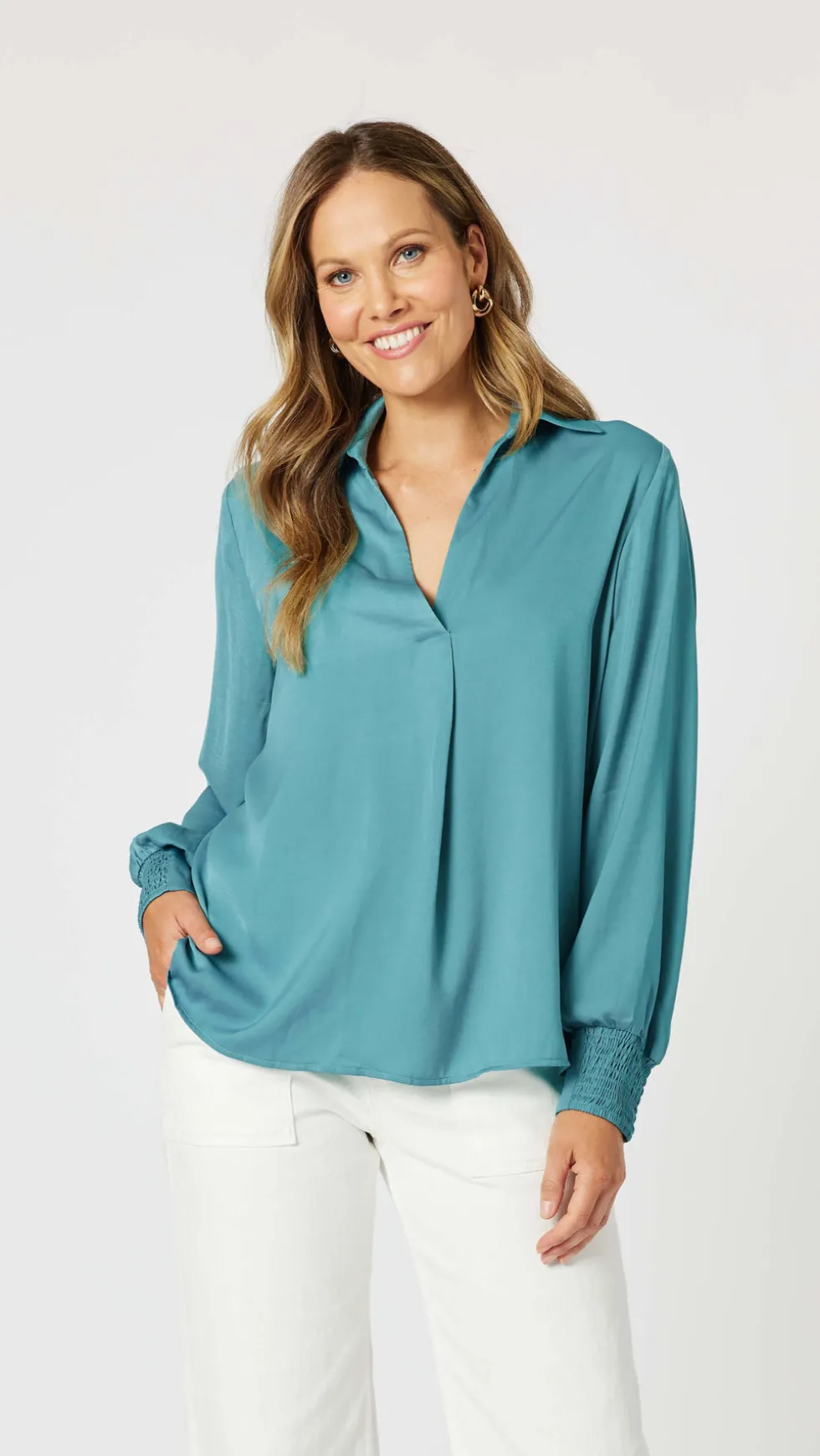 The Hammock & Vine Luxe Top 47291 at The Wardrobe is designed with a flattering, flowing silhouette The elegant collar and V-neckline add a touch of sophistication, while elasticated cuffs offer versatile styling options. It transitions seamlessly from day to night, making it the perfect choice for both a polished