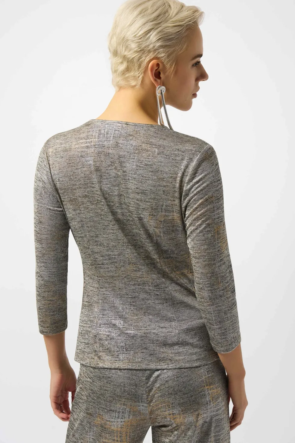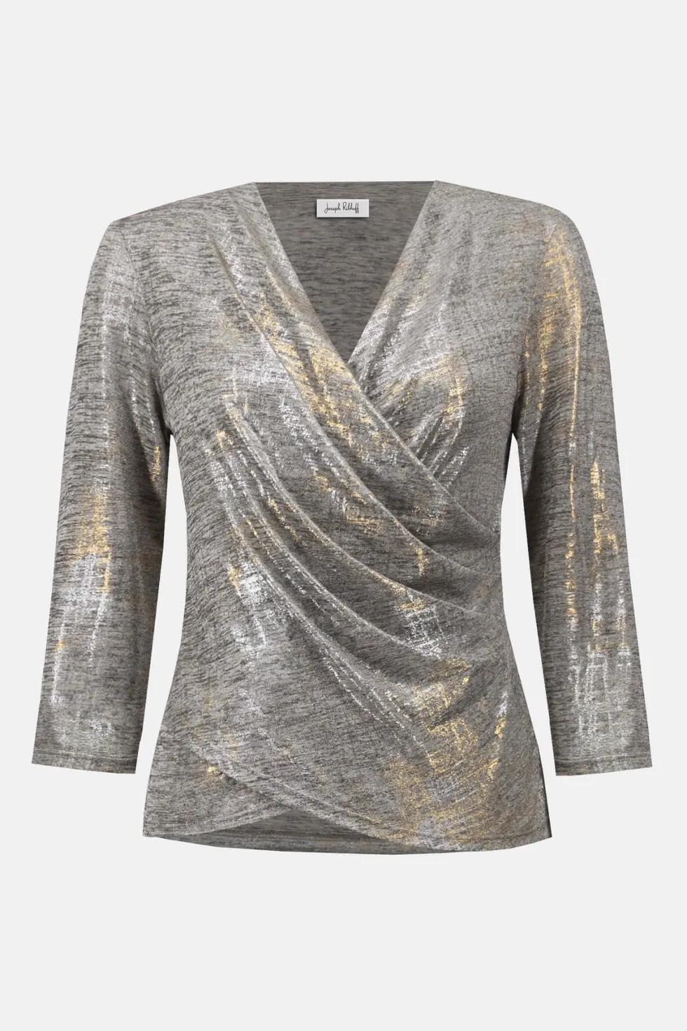Supernatural Foiled Mélange Knit Wrap Top – Beige 253087 by Joseph Ribkoff at The Wardrobe Showcase your distinctive style with this striking foiled mélange knit top. The wrap neckline adds a sophisticated twist, while the abstract print lends a dramatic flair to the design. The three-quarter sleeves and front pleat de