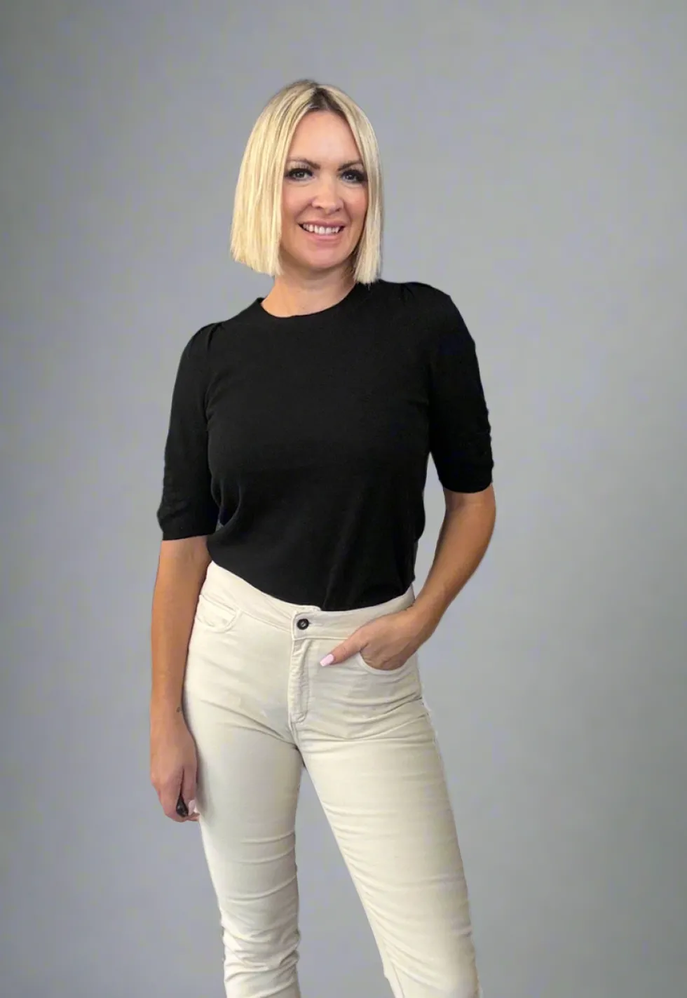 55% Extra fine Merino Wool (Ethically sourced) 45% Cotton Crew neck tee, in a merino blend, with ribbing detail and gathering on the shoulder, and ruching on the sleeve. Perfect as a layering piece.
