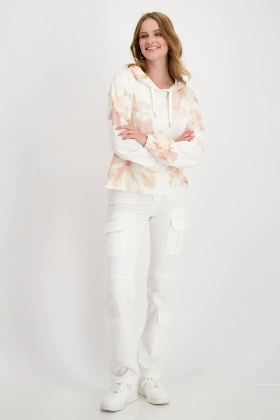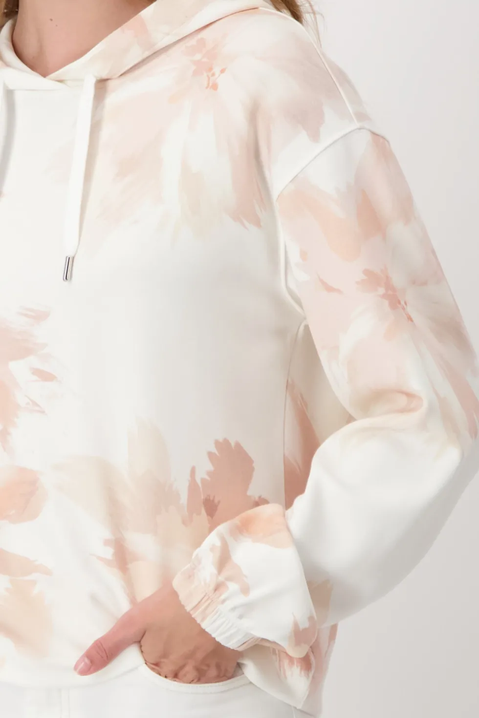Peach Flower Hood Top 808074 by Monari at The Wardrobe. 52% modal; 42% polyester; 6% elastane Modal blend; Elastic material; Sweatshirt; Soft feel; All-over floral pattern. Regular fit; Hood with cord; Long sleeves; Elasticated sleeve hem; Extended,rounded back. Wash on wool program/With similar colours.