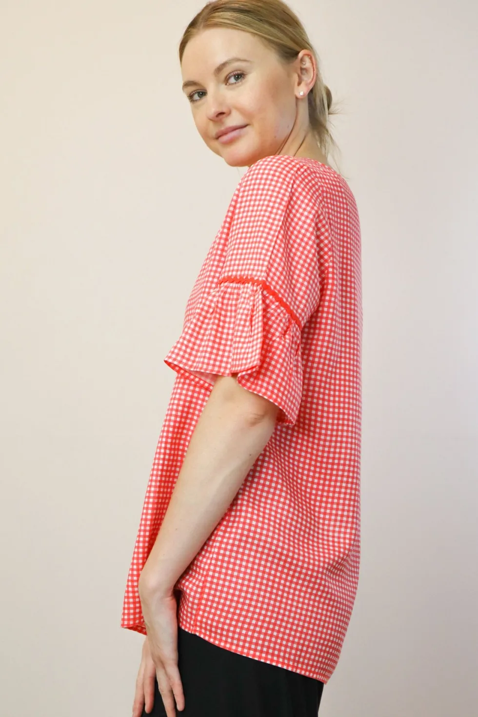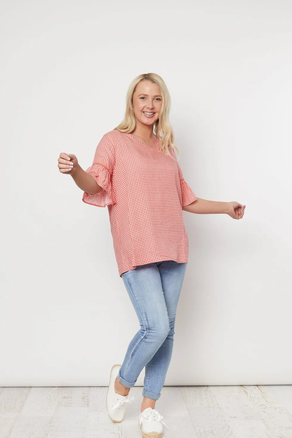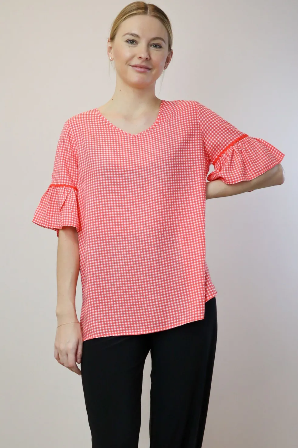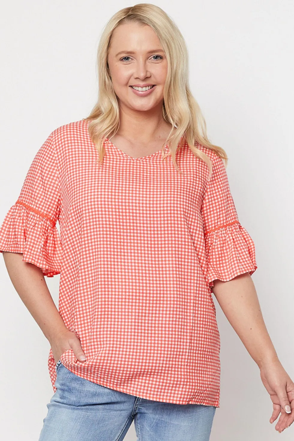 Not sure what to wear? We've got you covered! These tops are perfect for any occasion and can be paired with jeans or leggings. The Threadz ruffle sleeve top will add some femininity while also being versatile in your everyday wardrobe collection. V neckline 100% Viscose Ruffle sleeve Longline Straight fit Check print