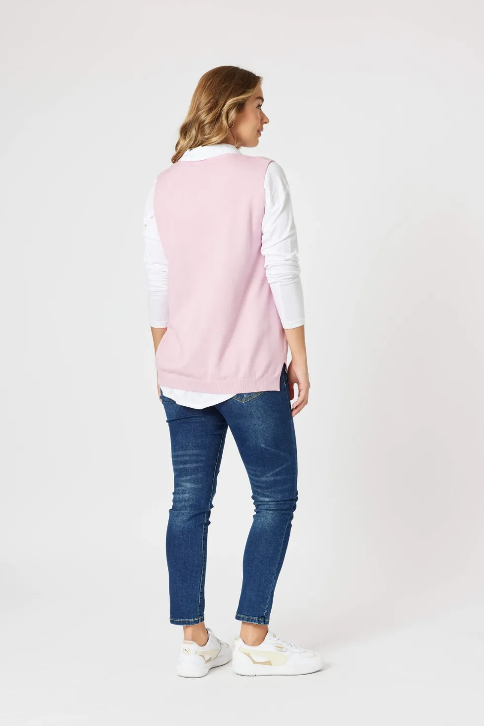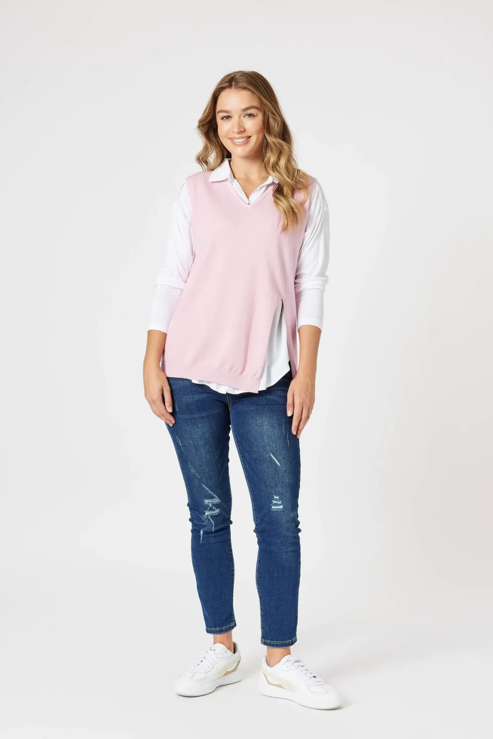 Vicky Side Split Knit Vest – Pink 44373 by Threadz at The Wardrobe Our Best Selling Knit Vest is back and finally available in more colours! If you were lucky enough to get a black one last year, make way for the best basic you could add to your wardrobe. This SUPER SOFT knit is perfect for layering over plain or print