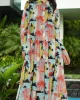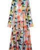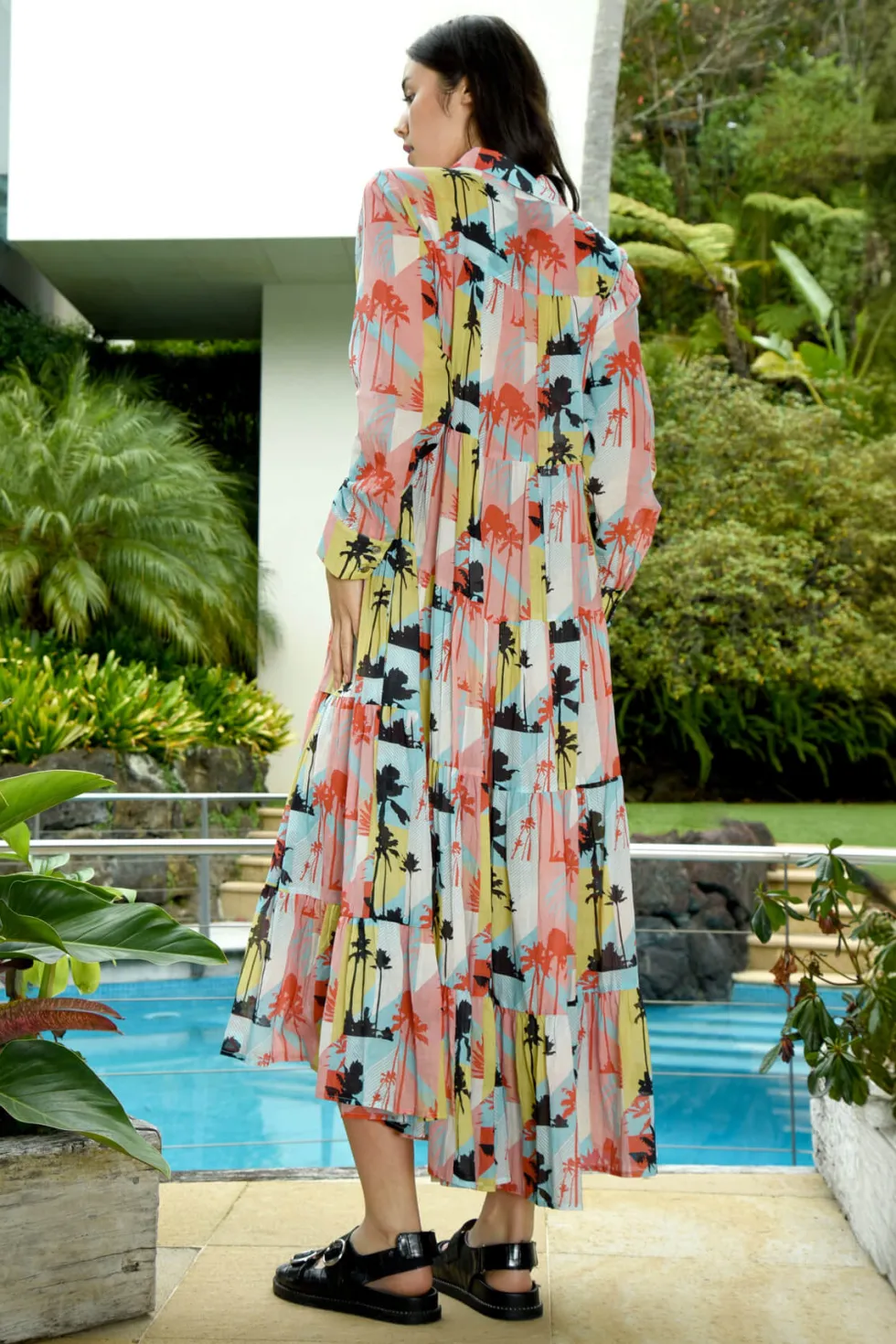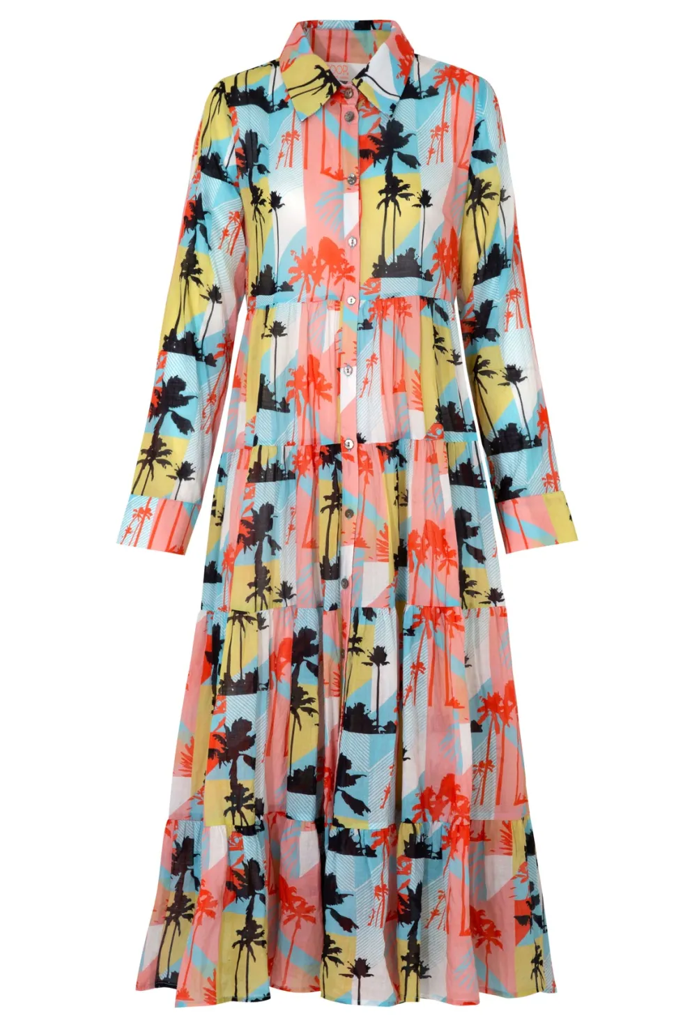 The âSun & the Swoonâ dress is the perfect work-wear solution that doesnât lack personality. Reimagined this season in the vibrant âMeet Me in Miamiâ cotton voile, this bold dress features a practical button through front, a simple collar and voluminous tiers that cascade down the body. This dress is sure to earn a
