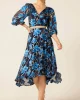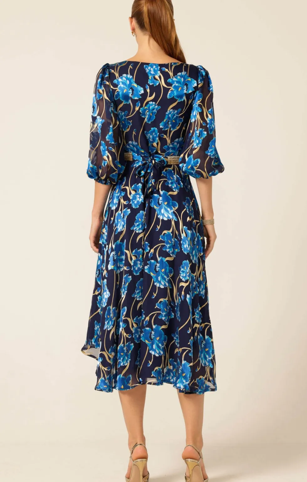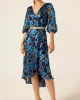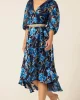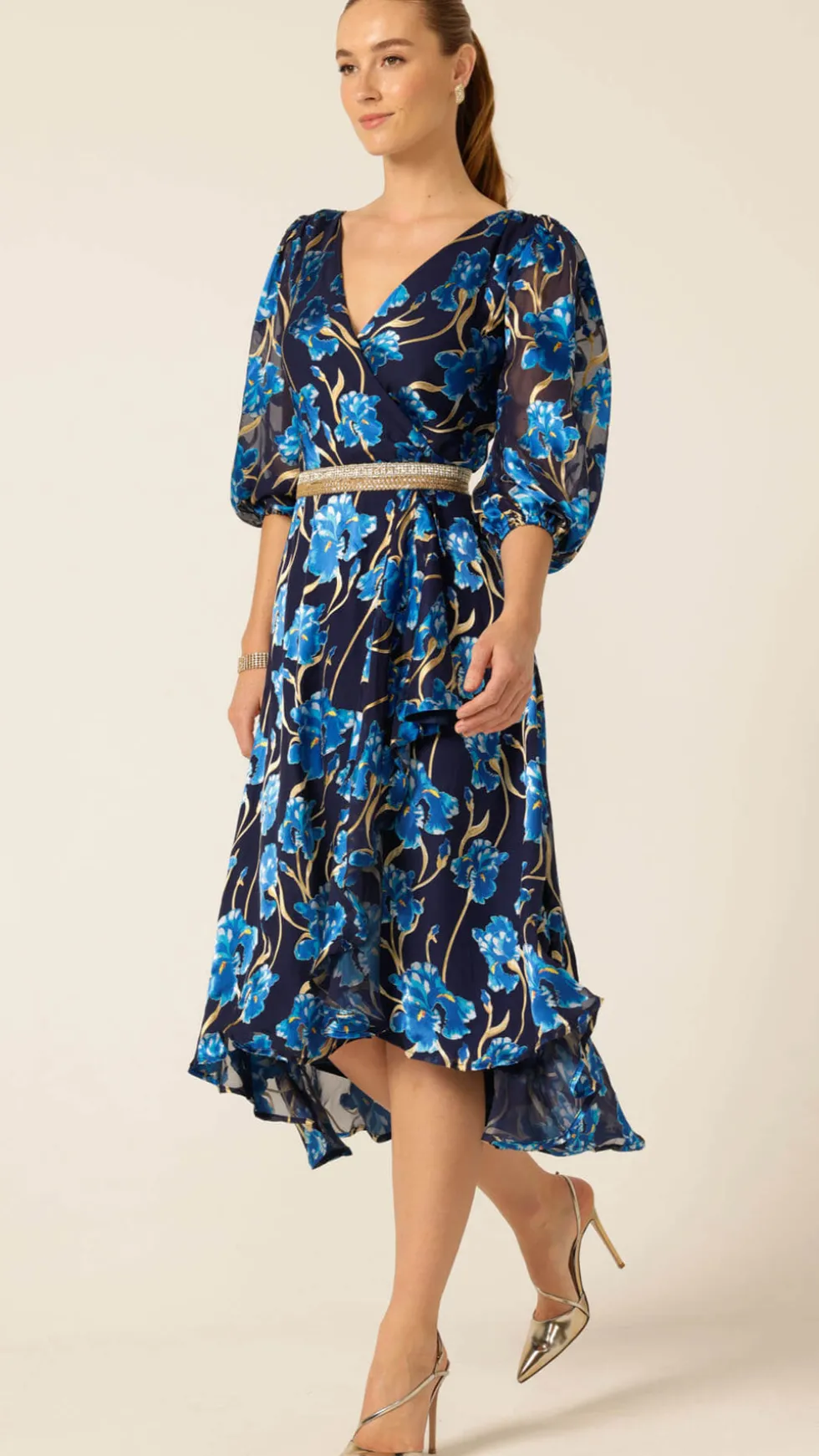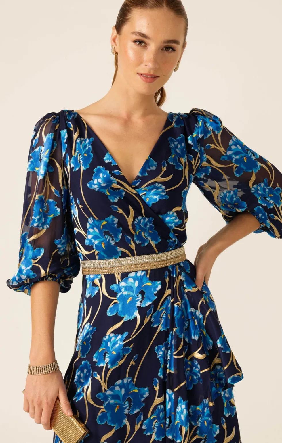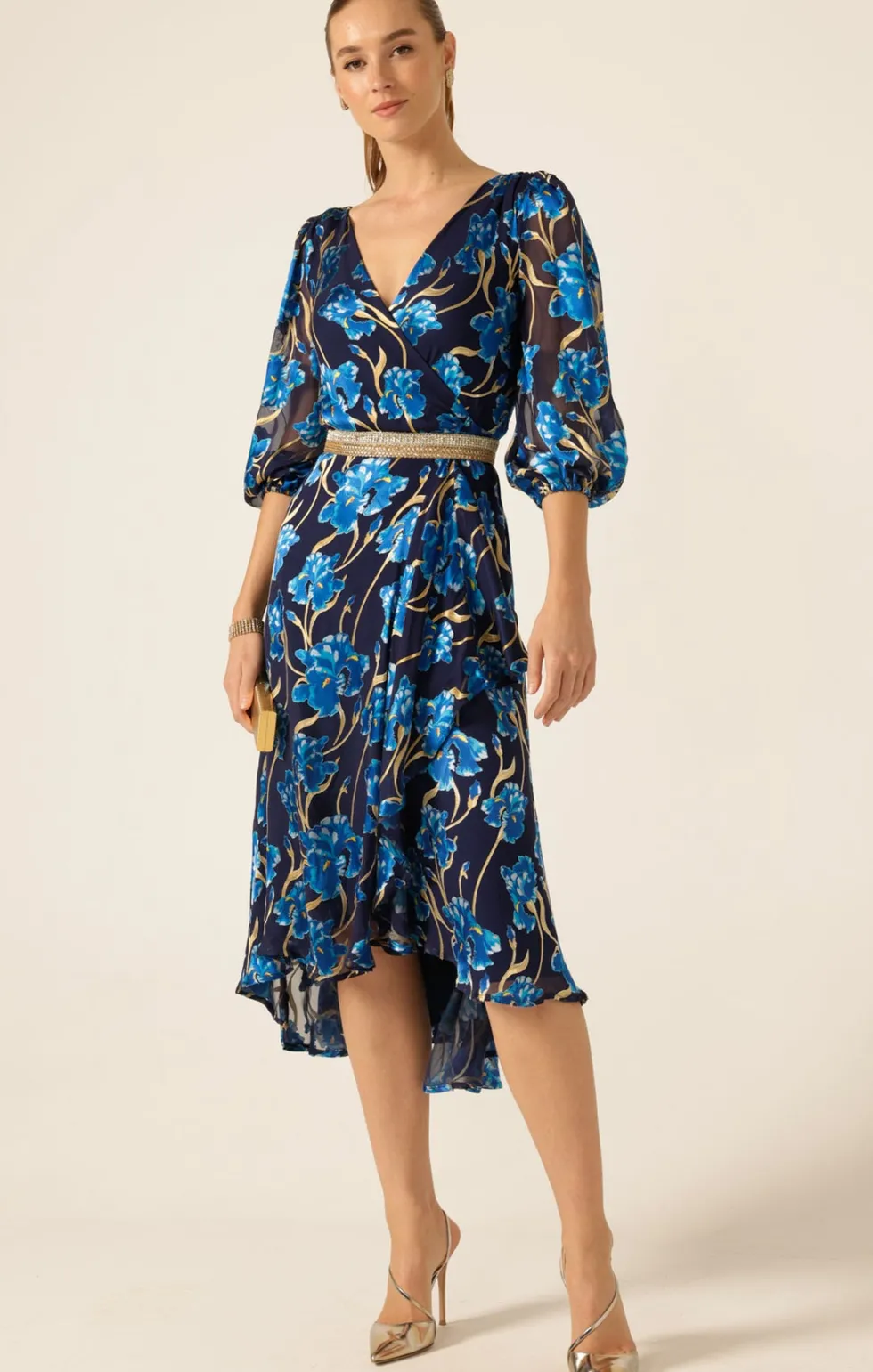 Linnee Wrap Midi Dress D17S25 – Blue Iris by Sacha Drake at The Wardrobe The Linnee Wrap Dress is made from a luxurious silk rayon blend and showcases SACHA DRAKE’s iconic wrap design in an exclusive print. Featuring bloused sleeves, a flattering A-line hi-lo silhouette, and a detachable sequin belt, this midi dress i